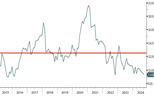Chart 2: MSCI China Fwd P/E (9.34x); 10-Year Average (12.45x)