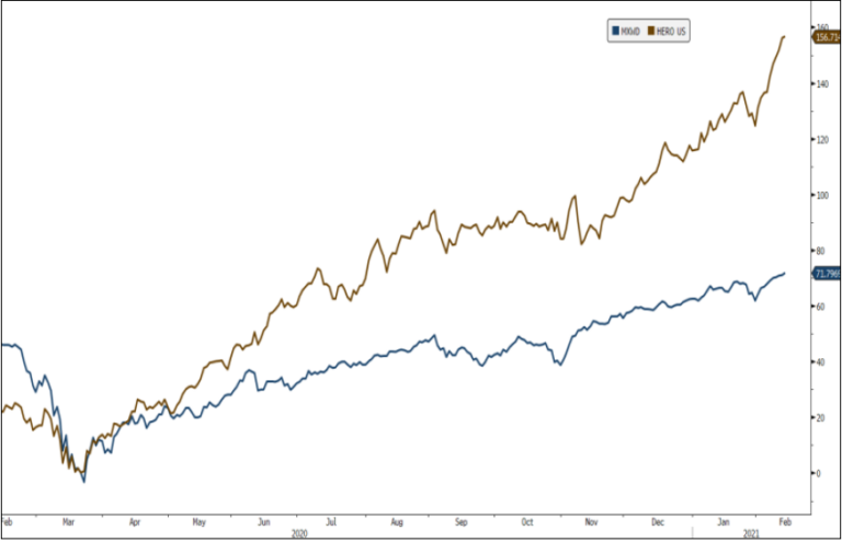 Chart 1: 03.2020-02.2021 MSCI World All (+72%); Global X Video Games & Esports ETF (+157%)