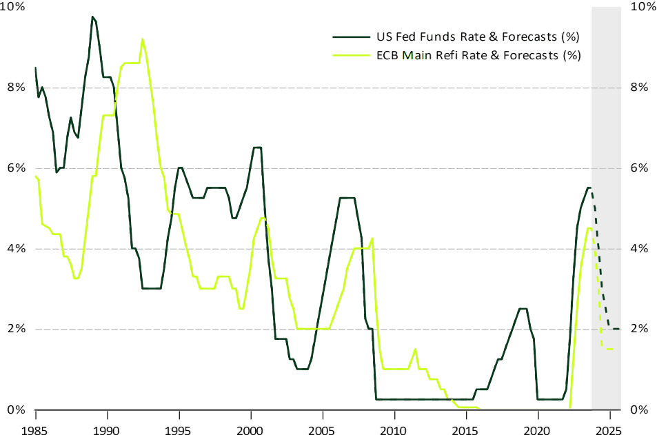 Chart 4: U.S. Federal Reserve Funds + Projections; ECB Main Rates + Projections