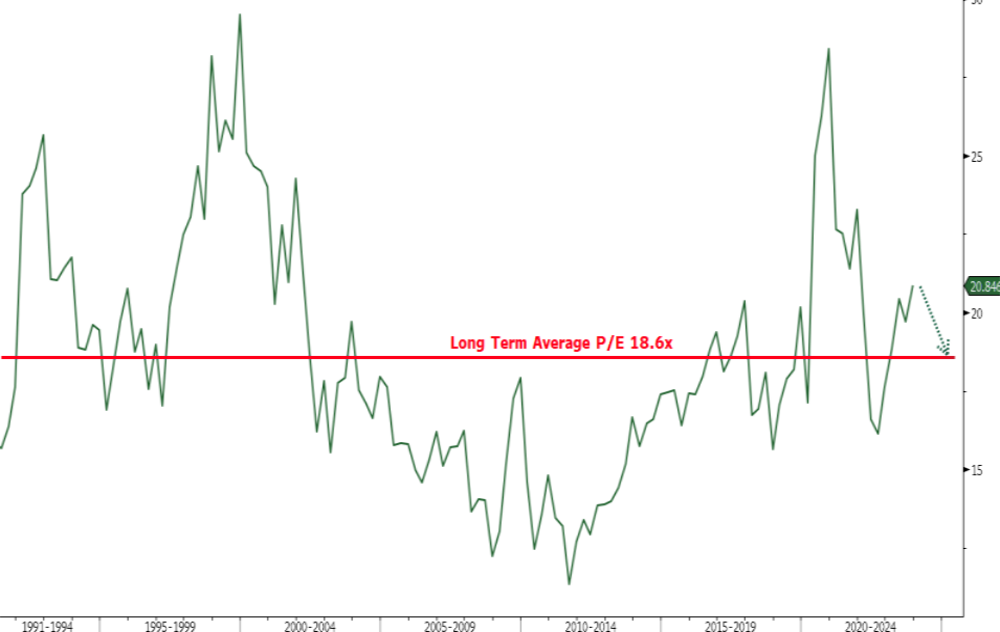 Now, if we consider the latter scenario, the combination of the market decline in US$3,500 and a reduction in Earnings Per Share of 10%, would reduce the market valuation towards its long-term average of 18.6 times (chart 6).