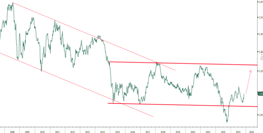 In the foreign exchange market, all currencies will benefit from the fall in interest rates and the consequent depreciation of the US dollar. The euro will undoubtedly appreciate (Figure 7). as the main alternative currency, while gold will no longer have anything to keep it below US$2,000 an ounce. So it is possible that after three long years of stability, its price will skyrocket.