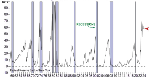 This is a warning sign that has yet to abate and continues to serve as a strong recession signal is the Fed's yield spread (recession probability) model. This model, which is based on the difference between 10-year and 3-month Treasury yields, has been indicating a recession since the spread reversed in late 2022.