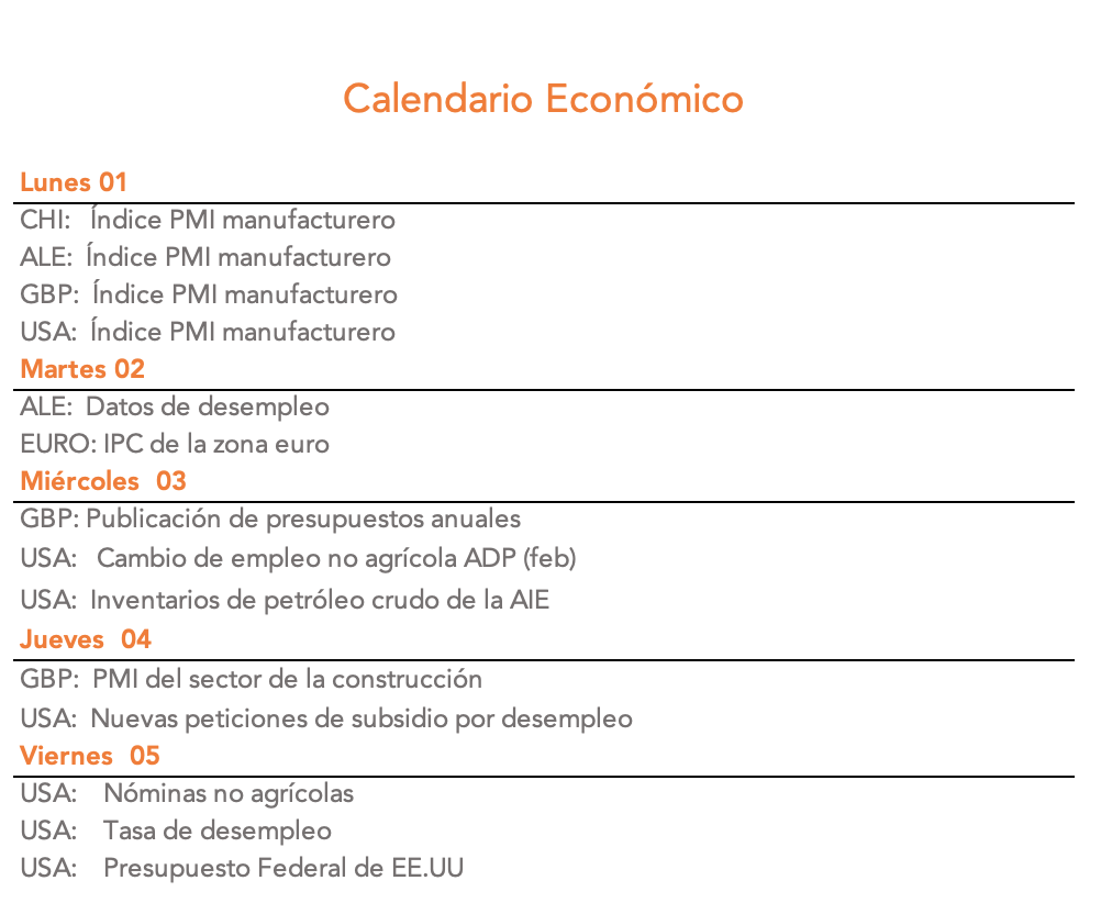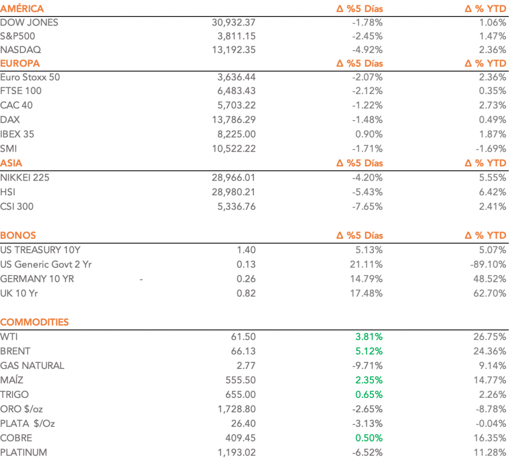 - In Europe, equities closed the week in negative territory, with the exception of the Ibex 35. European indices closed the month of February on a positive note. The Ibex 35 stood out, with a 6.03% and the Euro Stoxx 50 with a 4.45%.