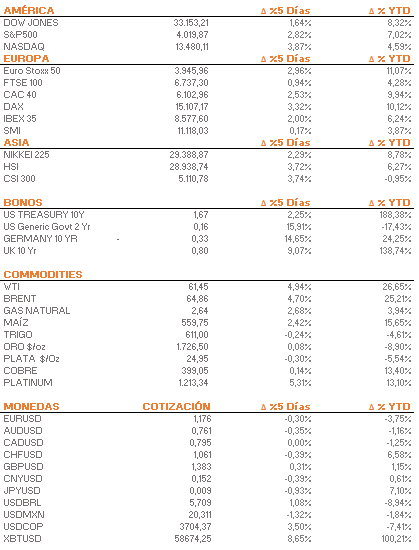- The US equity market closed the week on a positive note. The pace of vaccination is high and the market has positively accepted Joe Biden's proposal to invest $2 trillion in infrastructure in order to create "millions" of jobs. The S&P500 has passed the 4,000-point barrier for the first time last week.