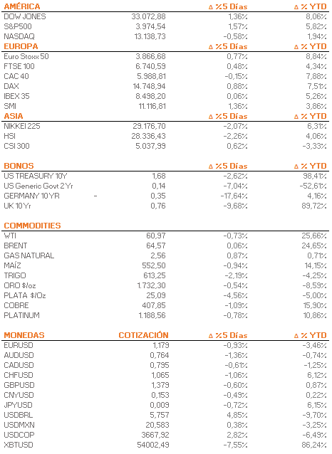 - In Europe, the week closed positively for the main equity indices. Among the most favored sectors were energy and mining, due to a rotation towards more cyclical sectors. The euro posted its second consecutive week of declines against the dollar.