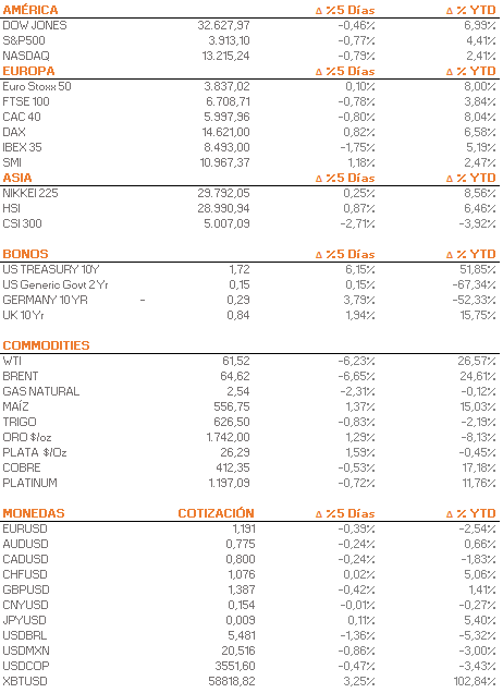 In Europe, the week closed mixed for the main equity indices. The strongest fall was seen in the Ibex 35 with a drop of -1,75% and the best performance was seen in the SMI with +1,18%.