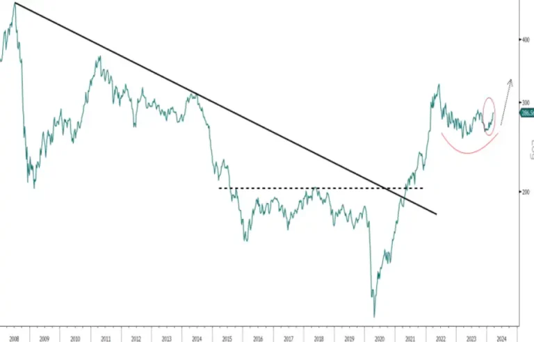 Viendo el sector más de cerca, observamos que después de un mercado bajista de 13 años hasta 2021, las materias primas mostraron signos de cambio en junio de 2021. Tras un aumento del 190% desde abril de 2020 hasta junio de 2022, ingresaron en un nuevo mercado alcista. La consolidación de precios desde 2022 es natural tras ese crecimiento. Tras 2 años de consolidación, anticipamos una continuación alcista a largo plazo.